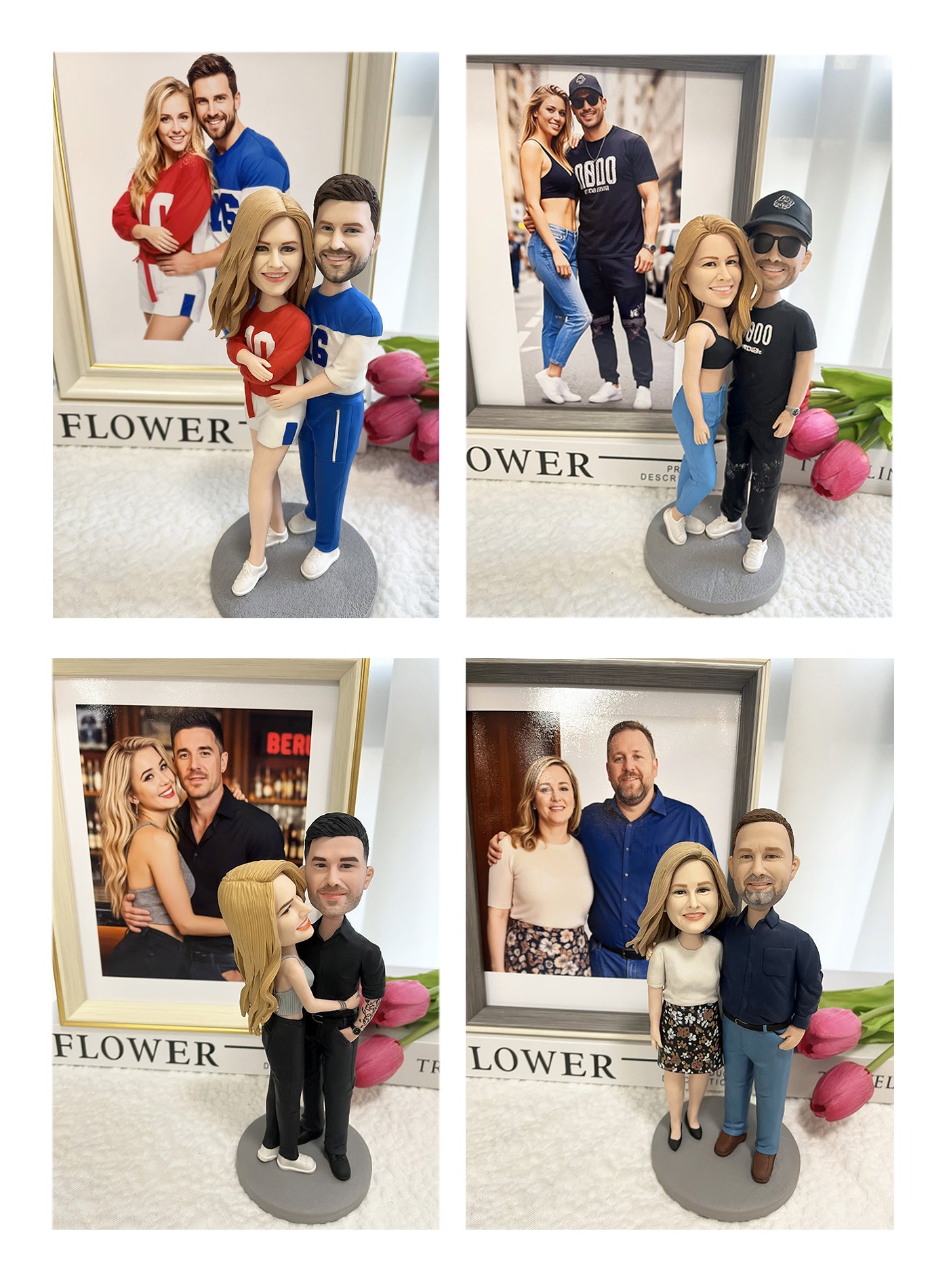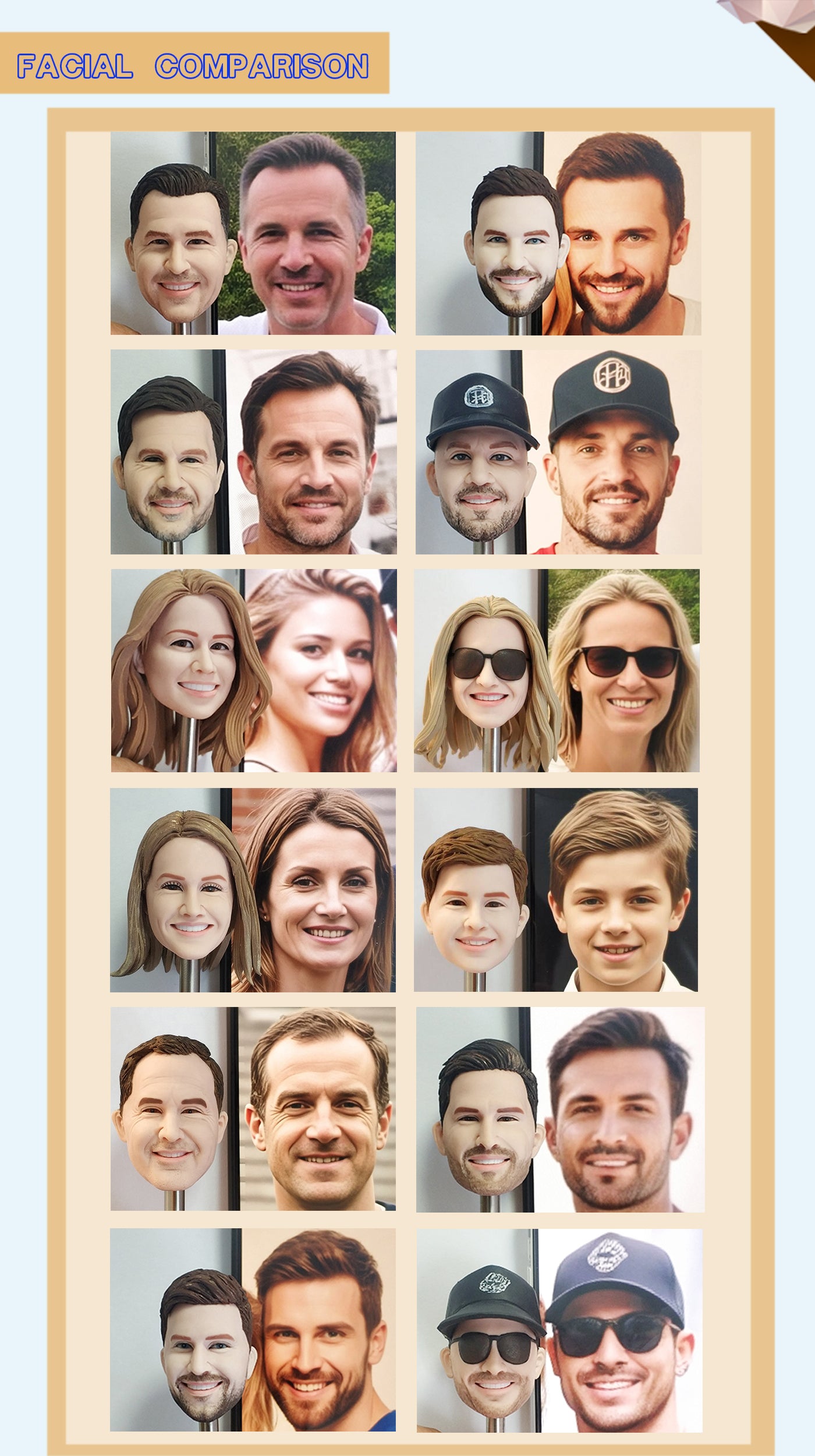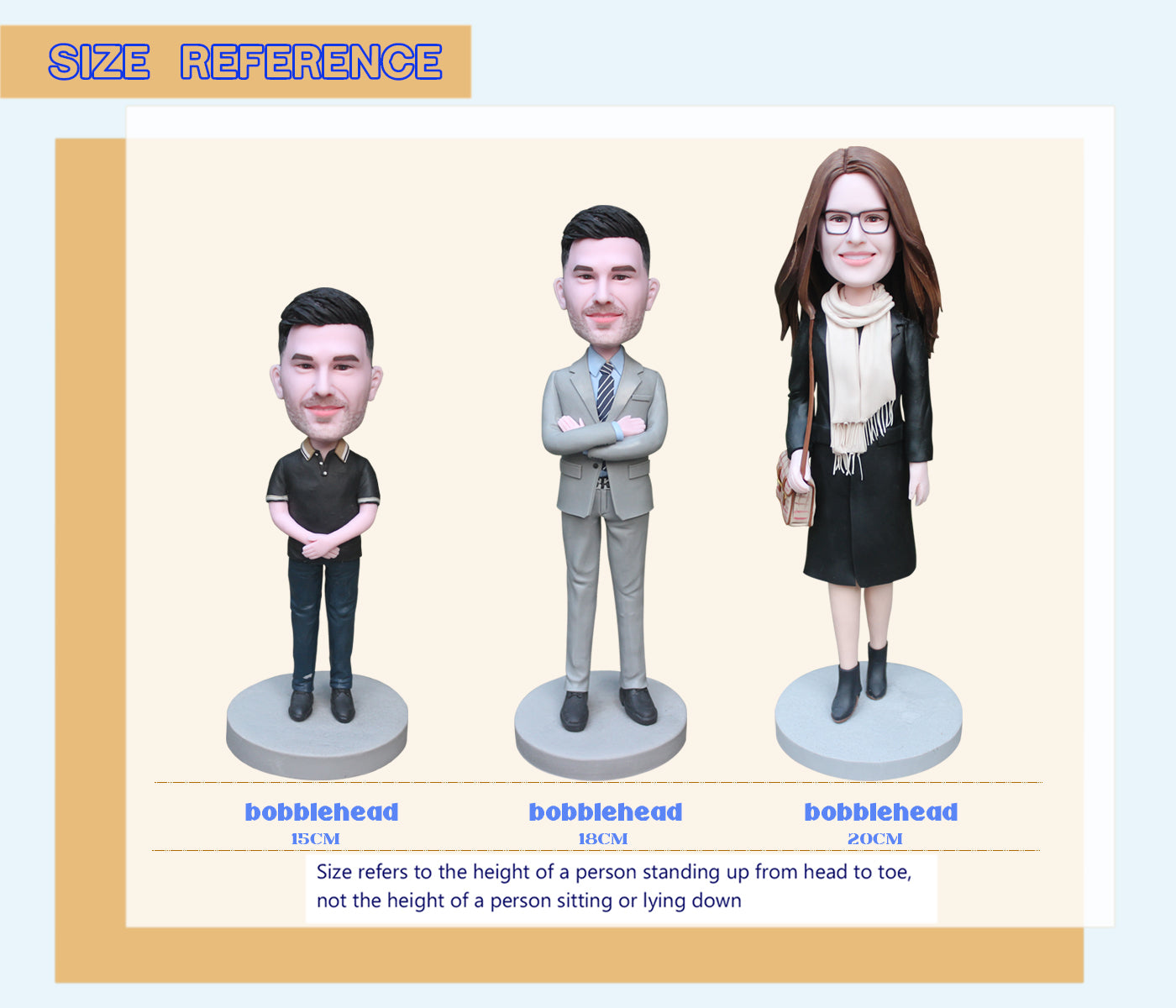 Regarding the skin color, it may not be 100% the same as the real person, because the characteristics of polymer clay and the actual color after baking will be slightly different. Note: Women with short hair are suitable for customized bobbleheads. (For customized bobbleheads with long hair, we will process the hair so that it all floats behind the shoulders and cannot be placed on the shoulders)